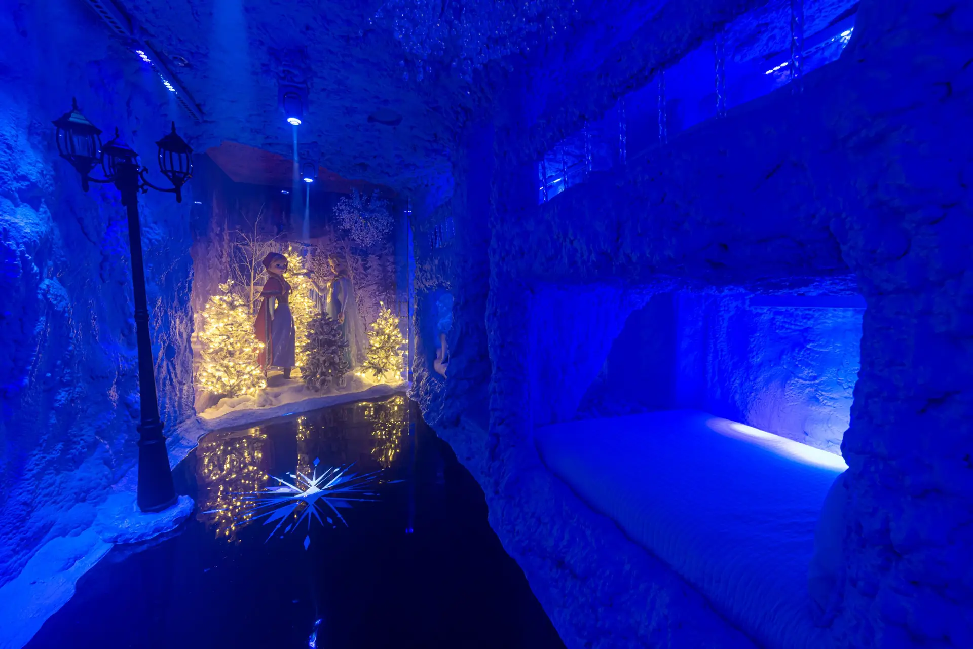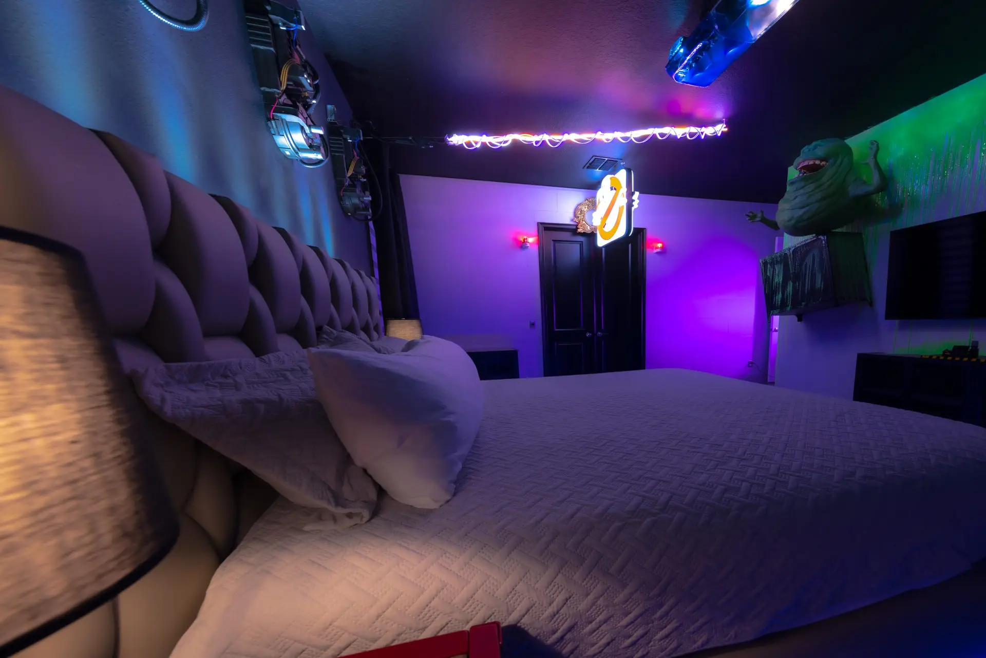 Your jaw will drop when you see the 8 bedrooms in Electronic Ice Castle. The first bedroom on the first floor is a Ghostbusters-inspired bedroom. This ghostly-themed bedroom features a king-sized bed and an en suite bathroom. Next, head over to the ET-inspired bedroom. You'll want to phone home sharing with your friends how amazing this bedroom is! Featuring a king-sized bed, this bedroom also has an en suite bathroom. The last bedroom on the first floor is a Back To The Future-inspired bedroom. Once you head in, you'll never want to go back! This bedroom features fan-favorite futuristic gadgets from the fabricators who worked on the movie, a king-sized bed, and an en suite bathroom. Upstairs, you'll find even more thrilling bedrooms. At the top of the stairs is a Sandlot-themed bedroom featuring memorabilia from the movie, a special canine friend, and a king-sized bed with a bathroom right outside the entrance to the bedroom. The next stop is the Home Alone-themed room. You'll be welcomed by the vintage 90's vibes, charming Christmas tree, and custom can chandelier. This room has a king-size bed and an en suite bathroom. The final adult bedroom has a modern, New York City, fashionista theme based off Sex and the City. This bedroom comes furnished with a king-sized bed and has an en suite bathroom. Kids are not left out of all the fun! Step into the first children's bedroom and be transported into a cave that leads to a land that children may find familiar. Marvel at a light show that is displayed throughout the room. Familiar characters are waiting for fun photo-ops, so be sure to have your camera ready! This bedroom has 2 bunk beds with full-sized beds and LED lights within each bunk and an en suite bathroom. Before you enter the final bedroom in the house, stop by the retro arcade and the theater room for round-the-clock entertainment! Test out the 80s and 90s classic arcade machines in the games room; one of the arcade machines opens the secret entrance to the final room! Open up the replica machine from a popular light cycle-themed movie and find yourself instantly transported to a digital dimension. A room that truly brings the WOW factor, the last kid's bedroom will be the talk of the house. Inside this familiar light cycle-inspired bedroom, guests will find 2 bunk beds with twin-sized beds. A replica bike from this popular movie can be found within the bedroom, along with a laser and light show that is activated by a secret touchpoint. This bedroom comes with 24-inch SMART TVs within each bunk, a 70" 4K SMART TV, Karaoke Machine, and has two en suite bathrooms. This one-of-a-kind house will provide your party with memories that will last a lifetime. No one will be able to stop talking about their amazing vacation! Book your stay at Electronic Ice Castle for an experience like none other!